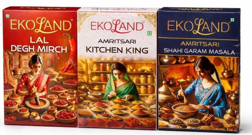 EKOLAND Combo    GROCERY  100% Natural Garam Masala, Kitchen King Masala & Lal Degh Mirch Powder | No Added Colours & Preservatives (100 Gram Each Pack)