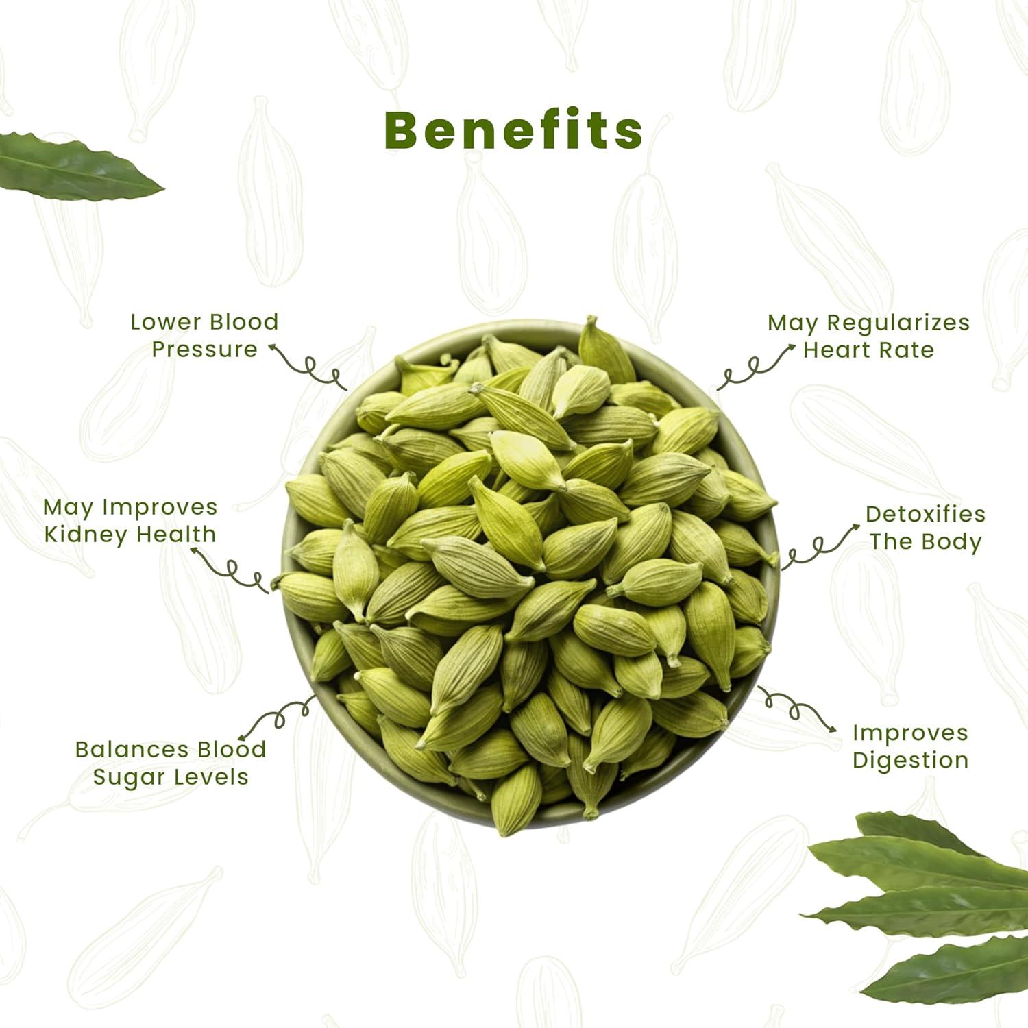 Health Benefits: Green cardamom is known for its powerful antioxidants that combat oxidative stress, promote digestion, and improve oral health. It's an excellent choice for those looking to enhance their diet naturally.