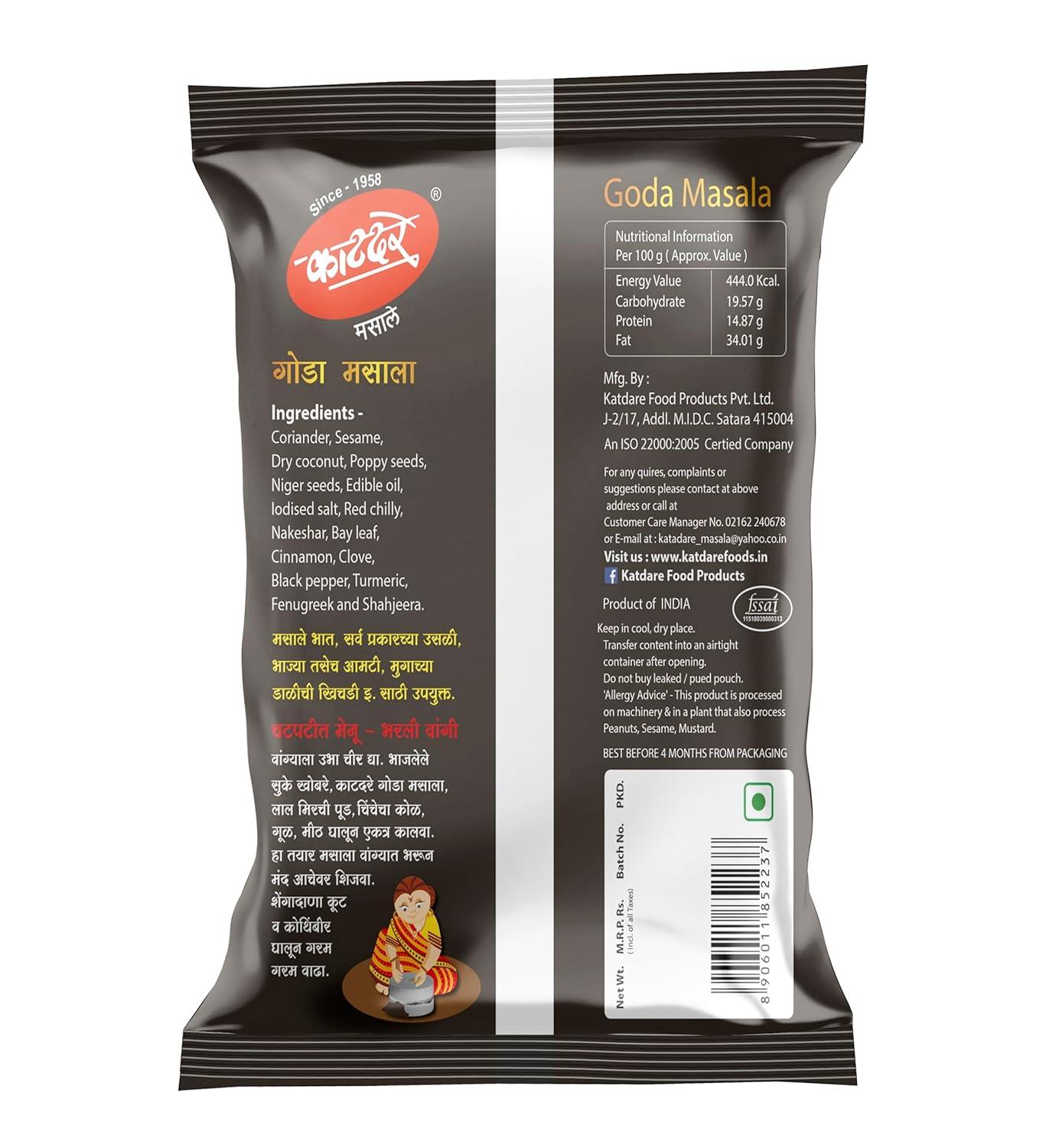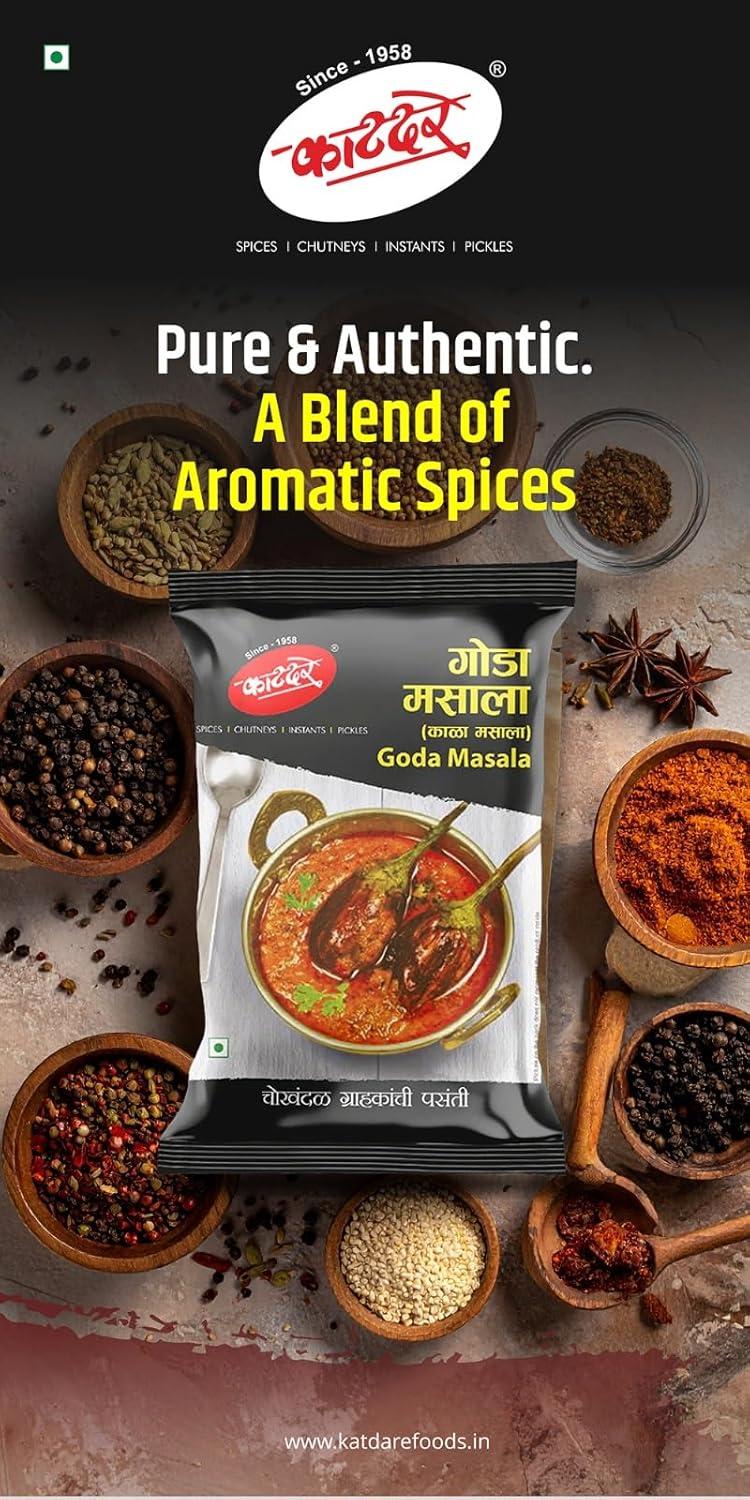 Each pouch of Katdare Goda Masala is made with a unique roasting process, ensuring maximum flavor and aroma. Coriander, dry coconut,seasame,poppy seeds,cumin, chilies, cloves, black pepper, and more are expertly combined to create a harmonious and balanced blend.