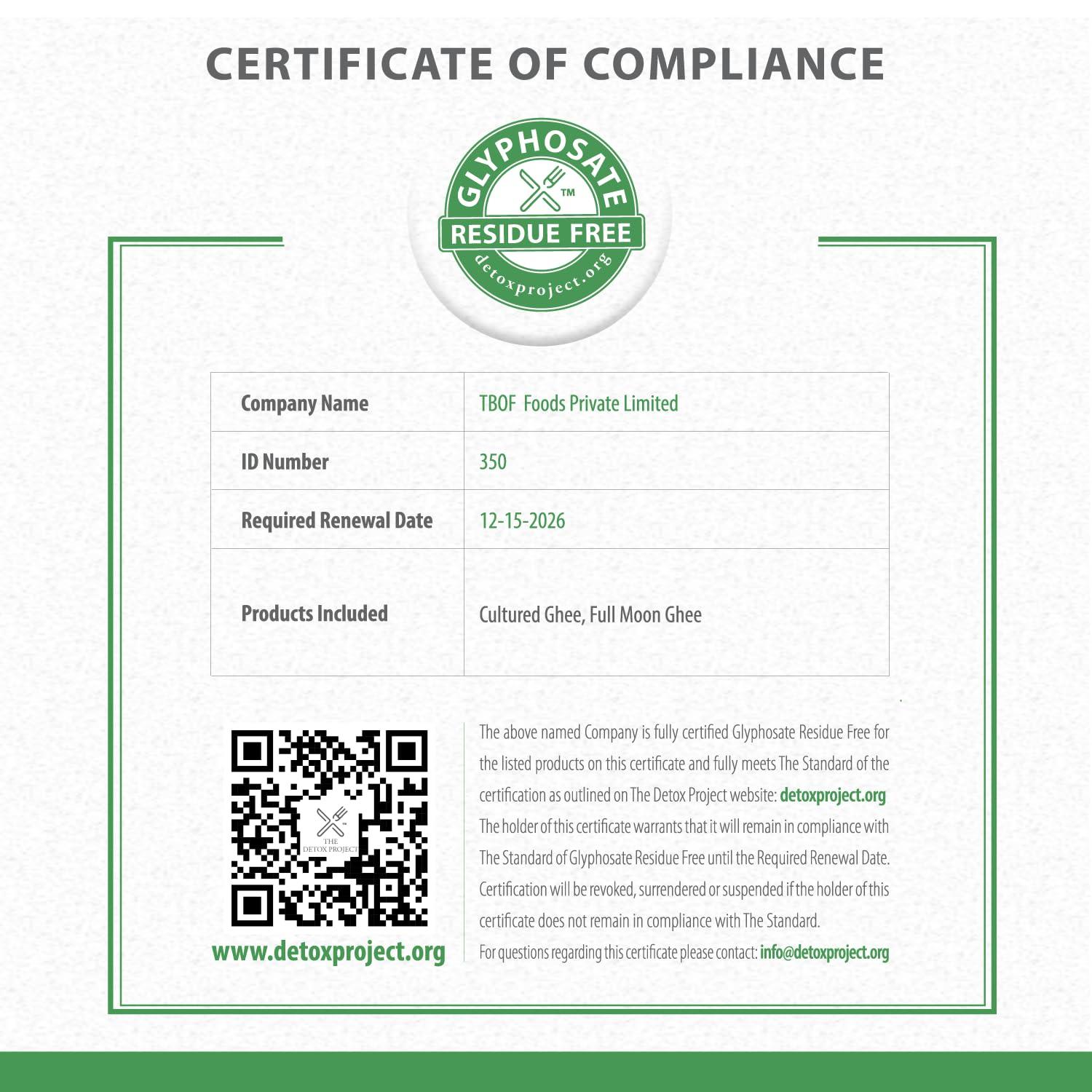 MADE DAILY IN SMALL BATCHES THAT ARE TESTED AND CERTIFIED GLYPHOSATE FREE BY THE DETOX PROJECT: glyphosate is a harmful weedicide banned in 20+ countries yet still permitted in India. It has links to cancer. It also travels from soil to cattle feed to ghee and can even be traced in humans.