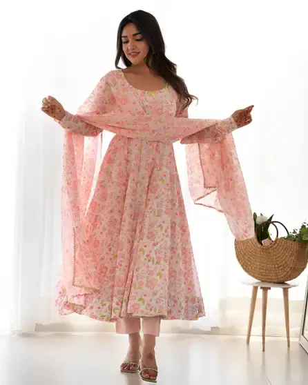 Color :Pink Color Code : Pinkfabric :GeorgetteIdeal For :Womensize :M,L,XL,XXL RegularStyle Code :AnarkaliSet-101Type :Kurta and Dupatta Set