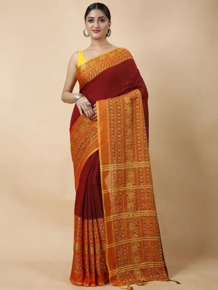 Other Details :Drape this beautiful saree from RUUPREKHA and look your absolute best and fashionable self. This Sari with large border looks pretty sophisticated and stylish. It also comes with an unstitched blouse piece. It is a luxurious saree in premium quality fabric and design and is a must have for you, this festive season. Style it with a golden clutch bag and stud earrings for a fabulous ethnic look.
