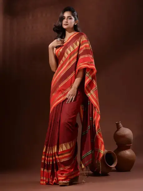 Other Details :MATERIAL: Handcrafted from premium khadi cotton fabric, offering comfort and traditional elegance in a maroon base colour with orange accents, DESIGN ELEMENTS: Features striking geometric border patterns with traditional temple-style motifs in contrasting colours, BORDER DETAILS: Adorned with intricate triangular patterns and stripes in orange and gold tones along the saree border, VERSATILE STYLE: Perfect for traditional ceremonies, festivals, and formal occasions with its classic maroon and orange colour combination, CRAFTSMANSHIP: Handloom-woven with meticulous attention to detail, showcasing traditional Indian weaving techniques