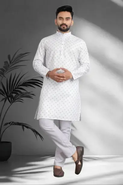 Men Solid Cotton Blend Straight Kurta (White)
