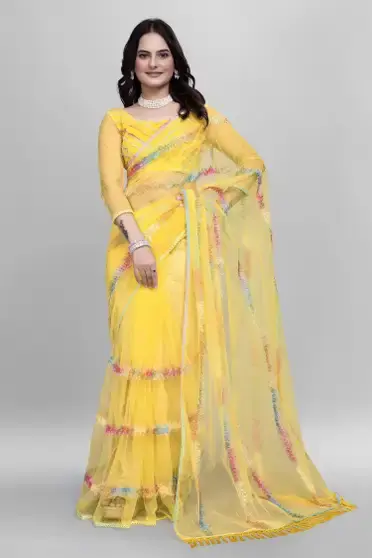 Pattern : Embroidered Pack of : 1 Occasion : Party & Festive, Wedding Fabric Care : Hand Wash Fabric : Net Type : Bollywood Blouse Piece : Unstitched Sari Style : Regular Sari Net Quantity : 1