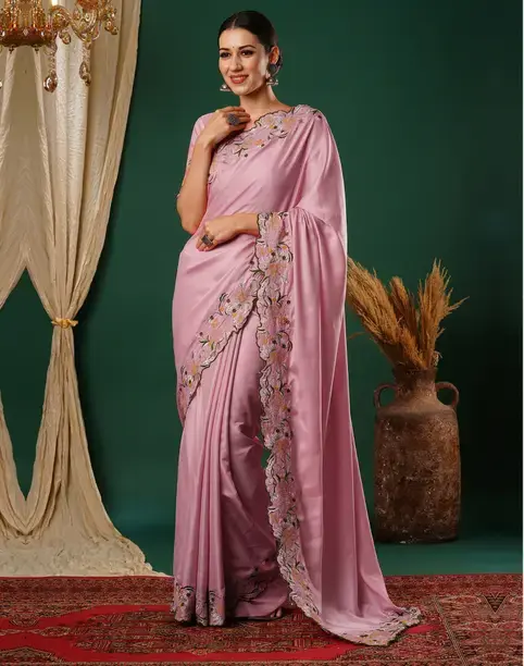 Construction Type :Satin Embroidery And Scalloped Border, Dyed Rose Pink Saree With Blouse Piece