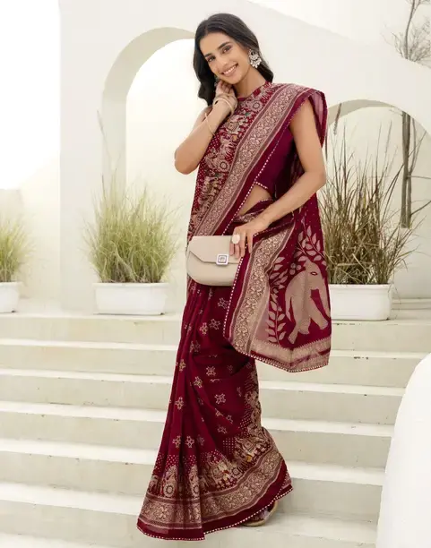 Construction Type :Silk Foil Printed & Gota Lace Maroon Saree With Unstitched Blouse