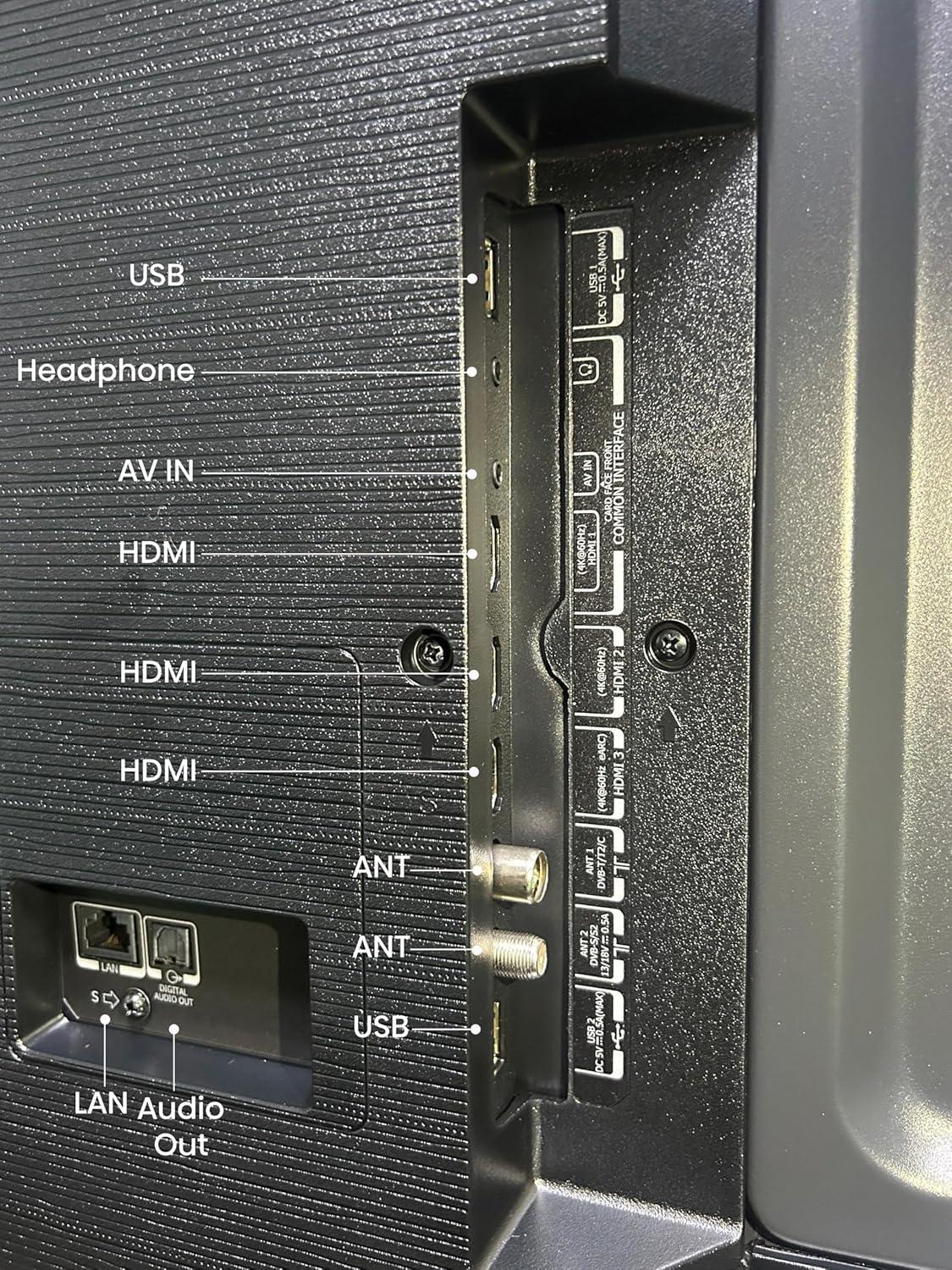 Connectivity: 3 HDMI 2.1 ports (HDMI 3 eARC supported) to connect set top box | 2 USB 2.0 ports to connect hard drives and other USB devices | Dual-band Wi-Fi | Bluetooth 4.2 | 1 S/PDIF Output | 1 Headphone Output | 1 Ethernet RJ45 | 2 RF Tuner | 1 Composite (AV) Inputs | Light Sensor | 1 Common Interface (CI+) | 1 Audio (L/R) Input