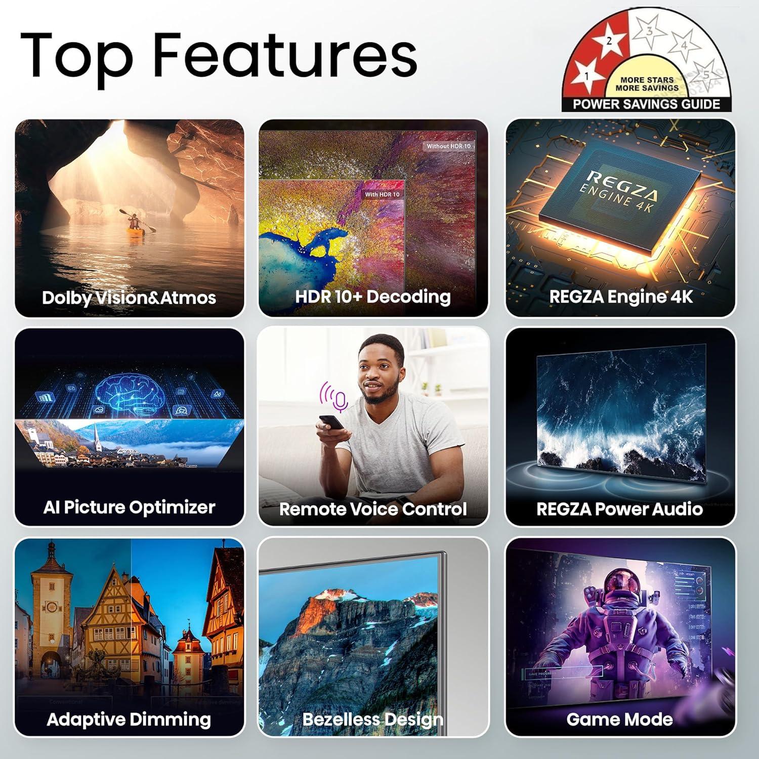 Smart TV features: VIDAA TV | Voice command | Screen Sharing | Voice Control | Smartphone remote control | Game Mode Plus | REGZA Engine 4K | AI 4K Upscaling | AI picture Optimizer | Supported Apps: Netflix, YouTube, Prime Video, Hotstar, SonyLiv, Hungama, JioCinema, Zee5, Eros Now