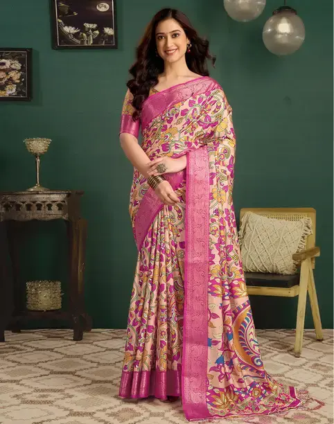 Construction Type :Tussar Silk Kalamkari Printed & Weaving Cream & Rani Pink Saree