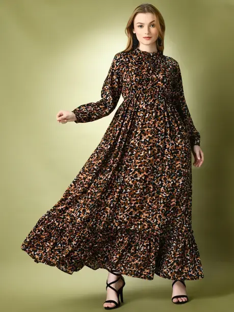 Other Details :Multicolor Abstract Printed Balloon Sleeves Frilled Maxi Dress features a vibrant multicolor abstract print and dramatic balloon sleeves. Frilled detailing adds a playful touch, while the flowing maxi length ensures elegance and comfort for any occasion.