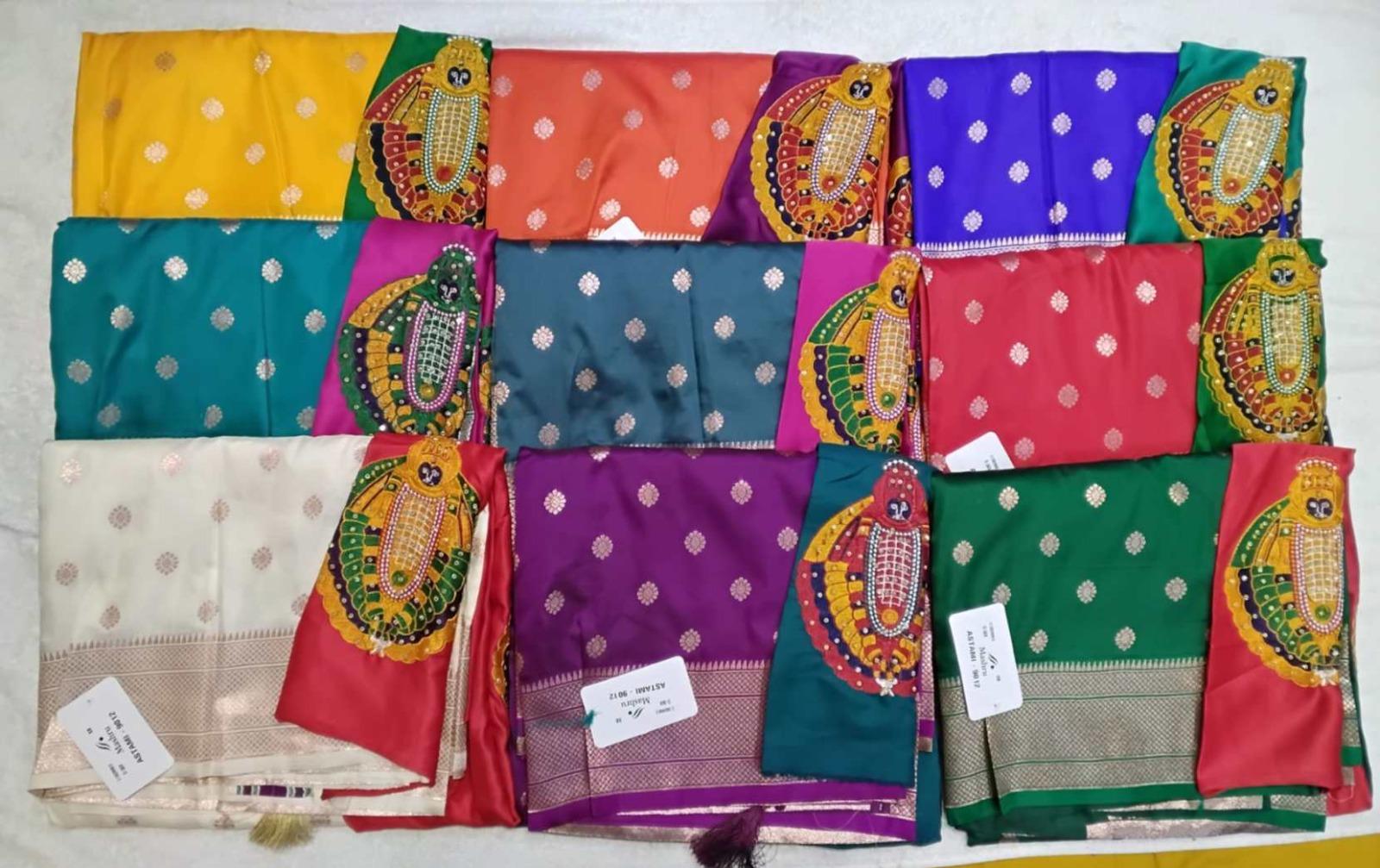 Beautiful silk sarees featuring traditional Astami temple-inspired embroidery, delicate butta work all over, and rich zari borders.