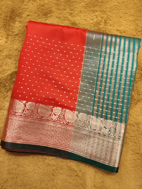 Woven, Striped Banarasi Dupion Silk, Chanderi Saree (Red, Light Green)