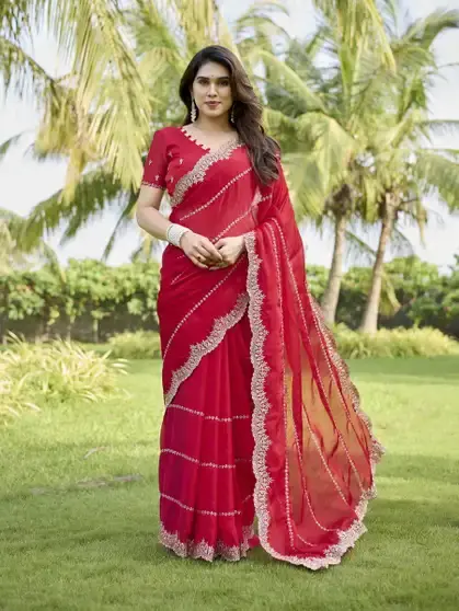 AMBUJAINTERNATIONAL Embroidered Bollywood Jimmy choo Saree (Red)
