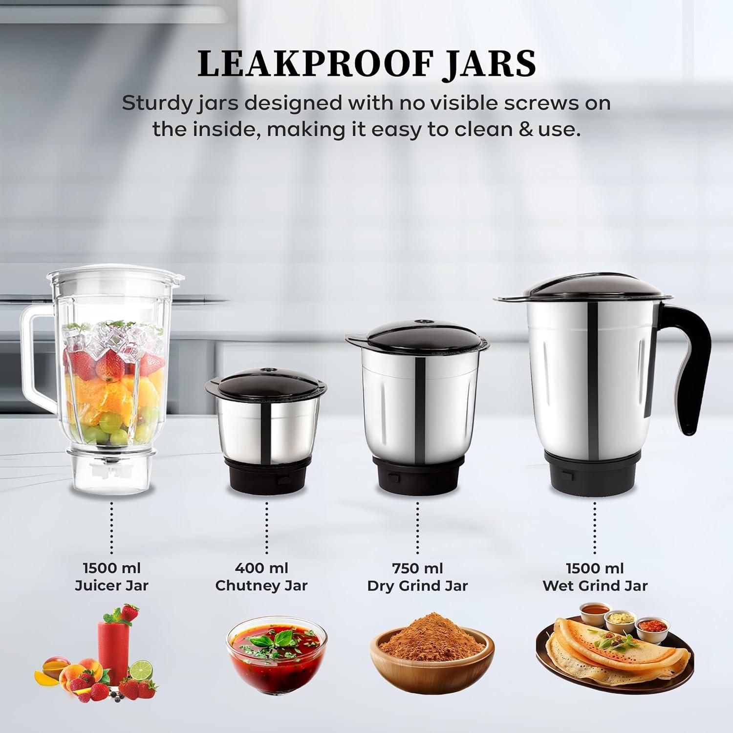 Durable Build with 4 Multipurpose Jars: 4 Jars (3 Stainless Steel Jars+ 1 Juicer Jar) for versatile usage for liquidizing, dry grinding, and blending for smoothies or masala grinding — making it a perfect blender mixer grinder. A perfect blender mixer grinder for every kitchen.