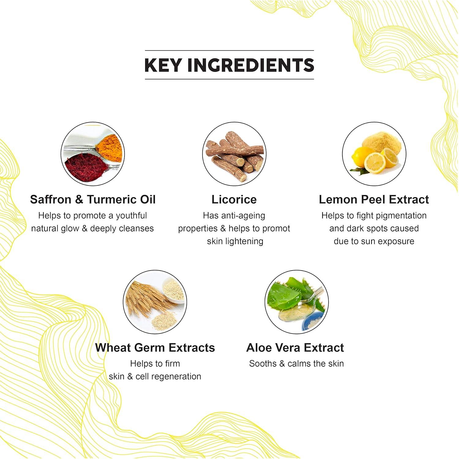 | Product Benefits | Lemon Peel Extract – Helps to fight pigmentation and dark spots caused due to sun exposure, Licorice – Has anti-ageing properties & helps to promote skin lightening, Promotes healthy & youthful Glow, Ubtan – Saffron & Turmeric Oil – Helps to promote a youthful natural glow & deeply cleanses Lemon Peel Extract – Helps to fight pigmentation and dark spots caused due to sun exposure, Licorice – Has anti-ageing properties & helps to promote skin lightening, Promotes healthy & youthful Glow, Ubtan – Saff… See more |