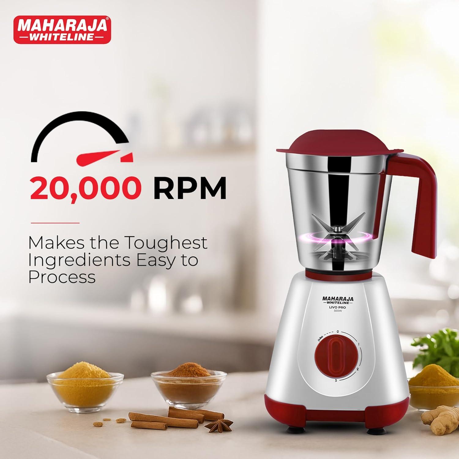 Maharaja Whiteline 500W Livo Pro Mixer Grinder with 3 Stainless Steel Jars with lid and 20,000 RPM Motor Speed (White & Cherry Red)