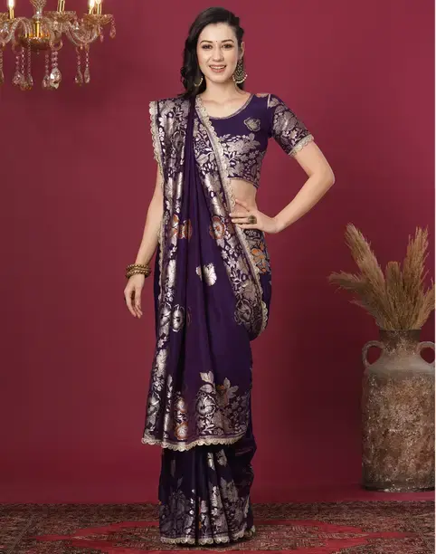Construction Type :Cotton Silk Weaving & Lace Dark Purple Color Saree With Blouse