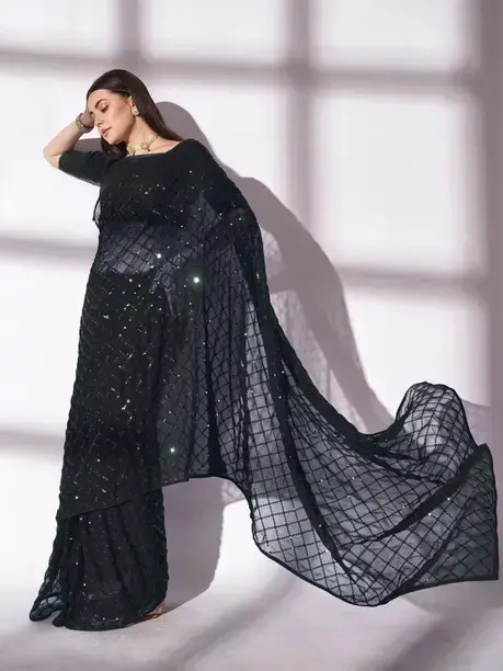 Other Details :Fabric :: Saree - Georgette | Blouse – Georgette , Work :: Stylish Sequence In Peach Sari and Contrast Blouse Piece, Saree - 5.5Mtr, Blouse - 0.8Mtr (Need To Be Stitched As Per Size And Fit), Care Instructions: Machine Wash