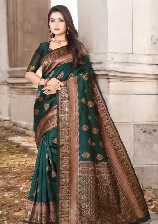 OXALIS Presents a Dark Green Copor Color Saree Ideal If You Are Looking For Sarees For Women Lichi Soft Silk Jacquard Woven saree, Heavy Golden Border saree, Jacquard Fabric saree, Kanjivaram saree, Banarasi zari silk saree, Glamours saree, Party wear saree, Wedding saree, fancy saree, Latest Collection saree, Beautiful saree, Indian wedding saree, handloom saree,silk, Embroidered Embellished saree, lace border saree ,Woven saree, Chiffon Solid Printed Saree ,Georgette Saree ,Plain tant saree, Bandhani saree, Printed Saree ,Chiffon Saree ,Chiffon Lace Border Saree , cotton Silk Saree, Bhagalpuri Saree, Art Silk saree ,Cotton , ikkat, Half & Half Saree ,Banarasi silk saree, Ruffle saree, tant saree, Net saree, floral design saree, Bollywood saree, khan saree, Maheshwari, Bhagalpuri, Chanderi, Kalamkari, Pattu, Mysore Patola saree, assam silk, leheriya, Paithani, bandhani, Bengali, durga puja,gota, Deepika saree, Kanchipuram Sarees, Kanchipuram Sarees, Tussar Silk Sarees,dyed saree, faux velvet,lilen saree, sequence saree.Kanjivaram sarees are primarily made from pure silk, Overall, a woven Kanjivaram pure silk or art silk saree is not just a piece of clothing; it's a piece of art that represents the rich heritage and craftsmanship of Indian textiles. It holds significant cultural and sentimental value for many Indian women and is a symbol of grace and elegance. As pure silk is a